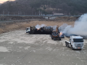 오늘 화재는 대가야읍 장기리 소재 폐기물재활용회사 공장 마당 내 금속분 화재가 발생한 것이다. 모래로 진화중, 바닥에 있는 금속가루 및 덤프