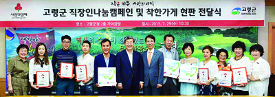 고령군은 지난달 29일 오전 군청 가야금방에서 곽용환 고령군수를 비롯해 김누리 경북사회복지공동모금회 사무처장, 차영귀 고령군사랑의열매나눔봉사단 명예단장, 여민수 고령군사랑의열매나눔봉사단장, 신규 직장인나눔일터 및 착한가게 대표 등 관계자들이 참석한 가운데 ‘착한가게 현판 전달식’을 가졌다.