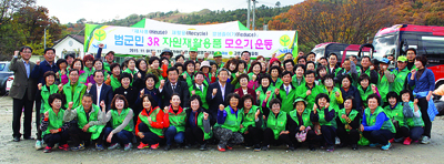 ↑↑ 지역 읍면 남녀새마을지도자, 지역주민 등 150여명이 참여한 폐농약병 수거활동을 가진 뒤 정해광 회장(두 번째 줄 왼쪽 일곱 번 째)을 비롯한 내빈, 회원 등이 기념촬영을 하고 있다.
