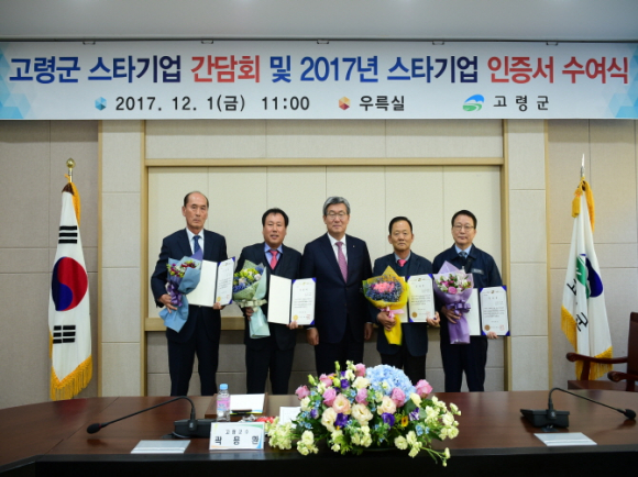 고령군이 지역경제의 리더 역할을 할 미래성장 유망 중소기업인 4개 업체를 스타기업으로 선정하고, 지난 1일 인증서 수여와 함께 현판 게첨식을 가졌다. 또 이날 관내 스타기업인 27개 업체 대표와 간담회를 가졌다.