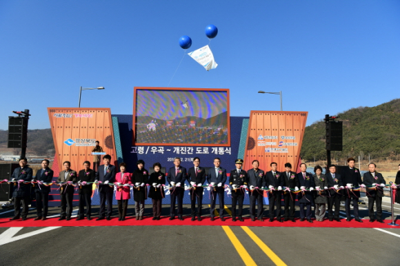 고령군 우곡면과 개진면을 잇는 국가지원지방도 67호선 고령~개진간 도로건설공사 개통식이 지난 21일 오전 11시 고령개진일반산업단지 입구에서 열렸다. 이날 개통식에는 곽용환 군수 김장주 행정부지사, 이영희 군의회 의장 및 의원, 박정현 도의원, 지역주민 등 500여명이 참석했다,