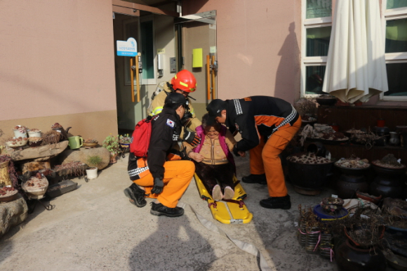 특히 피난에 어려움이 있는 노인복지센터의 특성을 고려하여 재원자 9명을 실제로 대피시키는 훈련을 진행했으며, 훈련 후에는 관계자에 대한 CPR 교육과 소화기 사용법도 병행했다.