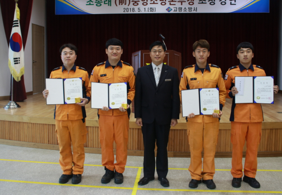 고령소방서가 지난 1일 3층 대강당에서 전 직원들을 대상으로 5월 정례조회 및 직장훈련을 실시하면서 지난 2월 7일 심정지로 쓰러진 경찰관의 소중한 생명을 구한 황기홍 소방교 외 3명에 대한 하트세이버 배지 및 증서를 수여했다.