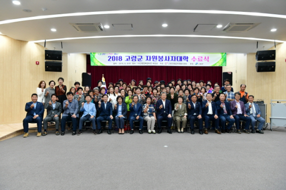 (사)고령군종합자원봉사센터(이사장 이왕조)가 지난 5일 다산행정복합타운 다목적강당에서 자원봉사자대학 수강생, 등 120여명이 참석한 가운데 2018 고령군 자원봉사자대학 수료식을 가졌다. 대학 교육은 지난 7월 10일부터 9월 5일까지 주1회 총 9주 동안 110여명의 자원봉사자를 대상으로 자원봉사의 이해, 자원봉사자 기본태도 및 소양, 현장체험학습 등의 내용으로 자원봉사자들의 자질을 향상시키고, 전문교육을 통해 자원봉사활동의 질적 발전을 도모했다. 이날 곽용환 군수는 격려사를 통해 자원봉사자들의 노고를 치하하며 “자원봉사 활동영역이 점점 다양화, 전문화되고 있는 실정으로 이번 자원봉사자대학을 통해 배운 전문기술을 바탕으로 우리지역의 소외계층에 먼저 다가가 따뜻한 정을 나눌 수 있고, 현장중심 자원봉사활동을 하는데 중추적인 역할을 해 줄 것”을 당부했다. 이지혜 기자