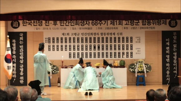 한국전쟁 전후 민간인희생자고령유족회(회장 김선욱)가 지난 12일 대가야박물관 강당에서 제1회 고령군 민간인희생자 합동위령제를 올렸다. 지역에서는 처음으로 개최된 이날 위령제에는 각 지역 유족회 관계자 및 유가족 등 100여 명이 참석해 한국전쟁 전후시기에 무고하게 희생된 민간인 희생자들의 넋을 위로했다. 위령제는 전통제례를 시작으로 추도사, 헌화 등의 순서로 진행됐다. 진실화해위원회 조사 결과 1948년~1950년 한국전쟁을 전후로 국민보도연맹 사건 및 민간인희생자 사건으로 인해 30여명이 고령 지역에서 국가 공권력에 의해 무고하게 희생된 것으로 밝혀졌다. 곽용환 군수는 추도사에서 “한국전쟁 전후 억울하게 희생되신 분들의 명복을 빌며, 오늘 이 자리가 긴 세월 슬픈 나날을 보내오신 유가족들의 가슴 속 응어리를 조금이라도 풀어드리고 평화와 정의가 살아있는 시대를 함께 만들어 갈 수 있도록 최선을 다하겠다”고 말했다.