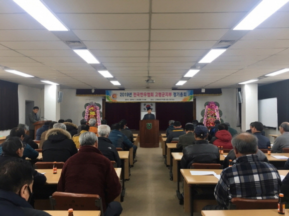 전국한우협회고령군지부(지부장 서교희)가 지난달 28일 고령성주축협 3층 회의실에서 윤문조 부군수, 문명희 고령성주축산업협동조합 조합장 등과 회원 130여명이 모인 가운데 2019년도 연시총회를 개최했다. 총회는 전년도 결산 보고와 올해 사업계획을 승인하고 나아갈 방향을 의논하는 자리로 서교희 지부장은 인사말에서 “한우농가 소득증대와 권익향상을 위해 노력하는 협회가 되도록 최선을 다 하겠다”고 말하며 각종 한우관련 현안사업 추진에 한우농가의 동참과 협조를 호소했다. 윤문조 부군수는 축사를 통해 “농촌경제는 축산업이 선도하고 있고, 특히 한우가 그 바탕을 깔고 있으나, 중국을 비롯한 각국과의 FTA 발효 등으로 인해 대내외적으로 어려운 실정이다”면서 “이에 한우협회 회원이 적극적으로 대응하면 어려움을 헤쳐 나갈 수 있으며, 고령군은 한우협회 회원의 농가소득 안정 및 증대를 위해 지원과 노력을 아끼지 않을 것”이라고 말했다.