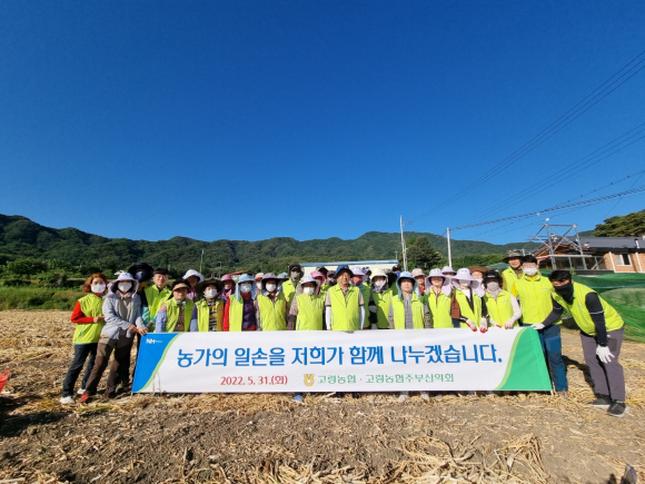 [고령군민신문=이형동 기자]고령농협(조합장 박종순) 임직원 및 고령농협주부산악회(회장 정무술)회원 등 30여명이 영농철을 맞아 인건비 부담과 농자재 가격 상승 등으로 어려움을 겪고 있는 농가를 찾아 바쁜 일손을 덜어 주었다.