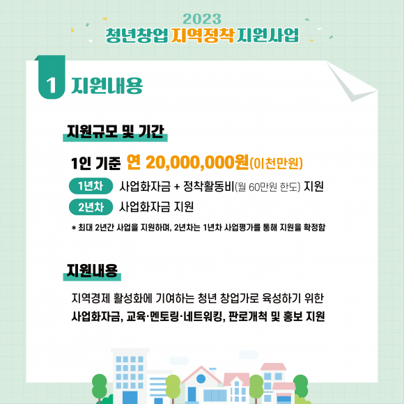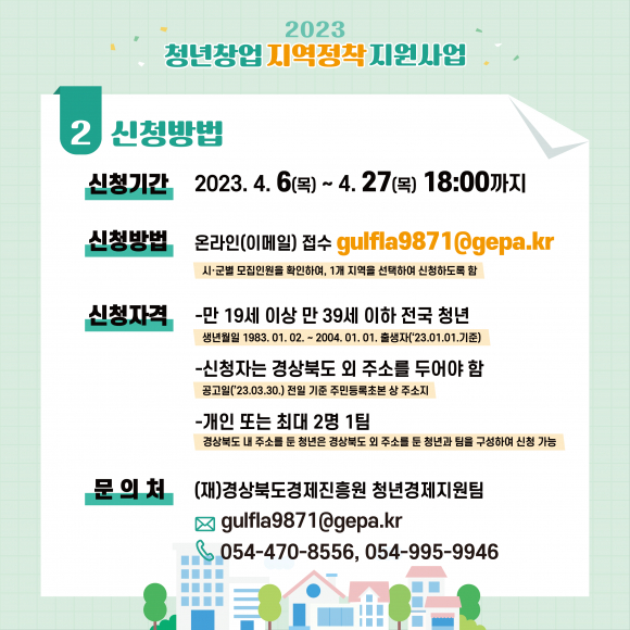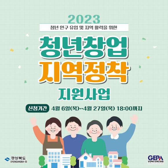 ‘청년창업 지역정착 지원사업’은 경상북도 지역자원을 활용한 청년 창업을 유도하고 타 지역 청년의 경상북도 정착 지원을 통해 지역활력을 도모하고자 시행하는 사업으로 모집대상은 경상북도 외 거주중인 만 19세 이상 ~ 만 39세 이하 청년으로(개인 또는 최대 2명 1팀) 경상북도 내 거주중인 청년은 타 지역에 거주중인 청년과 팀을 구성할 경우 참여가 가능하다.