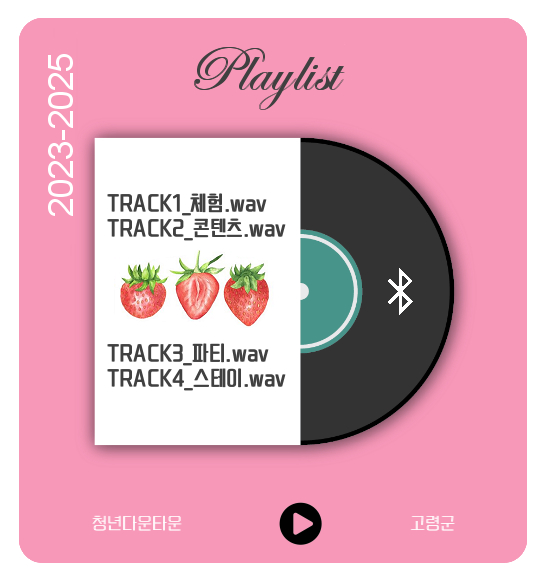 [고령군민신문=이상희기자] 고령군은 행정안전부 주관「2023년 청년마을 만들기 지원사업」에 고령군 1호 청년기업인 ㈜청년다운타운이 신청한 사업 ‘플레이리스트(Playlist)’가 최종 선정됐다고 밝혔다.