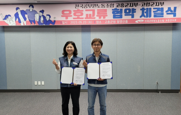 [고령군민신문=이상희기자] 전국공무원노동조합 고령군지부(지부장 류동열)는 5월 23일(화) 17시 고흥군청 팔영산홀에서 전국공무원노동조합 고흥군지부(지부장 장인화)와 양측 관계자 20여명이 참석한 가운데 우호교류 협약 체결식을 가졌다. 이번 체결식은 고흥군수 환영사, 고령군지부장-고흥군지부장 인사말, 고향사랑 교차기부응원챌린지, 우호교류 협약 체결식 순으로 진행됐다.