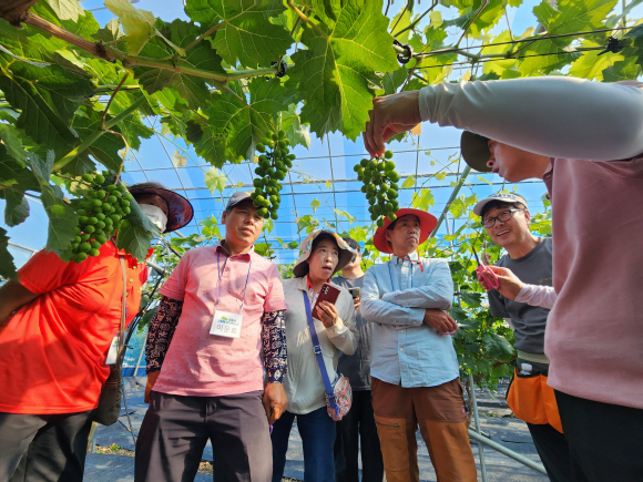 한편 농업기술센터에서는 신규 포도 재배 농가의 성공적인 정착을 위하여 포도 전문 지도사를 초빙하여 2022년에 이어 2년째 맞춤 교육을 실시하고 있다. 2023년 고품질 포도 생산을 위한 지역특화시범사업을 지원하며 사업에 맞추어 4월“월별 포도원 과원관리”, 5월 “화수정리실습 및 생장조정제처리 방법”6월“샤인머스켓 알솎기”교육을 실시하였다.