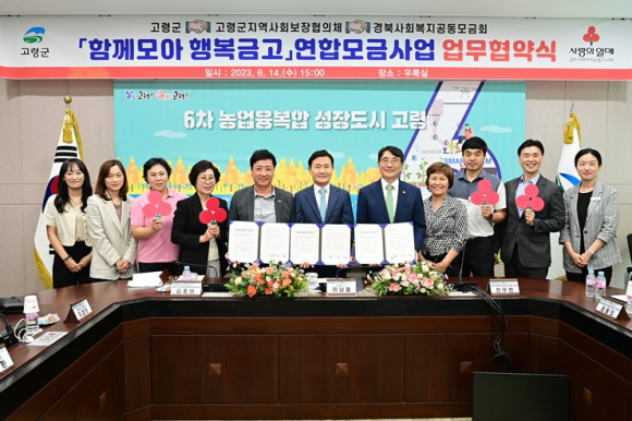 [고령군민신문=이상희기자] 고령군은 2023.6.14.(수) 군청 우륵실에서 경북사회복지공동모금회(회장 전우헌) 및 고령군지역사회보장협의체(공동위원장 김종태) 등 10여명이 참석한 가운데 「함께모아 행복금고」 연합모금사업 업무협약을 체결하였다. 이번 연합모금사업 업무협약을 통해 민관협력 확대를 통한 복지사각지대를 해소하고 지역사회 중심의 자원 개발 및 읍·면·동 지역사회보장협의체와 주민 네트워크의 활성화에 기여하고자 함을 목적으로 한다.