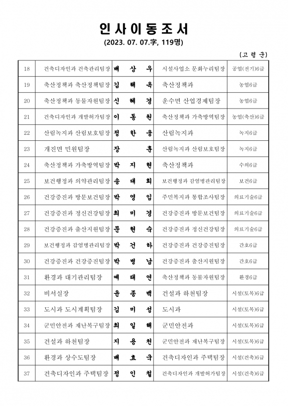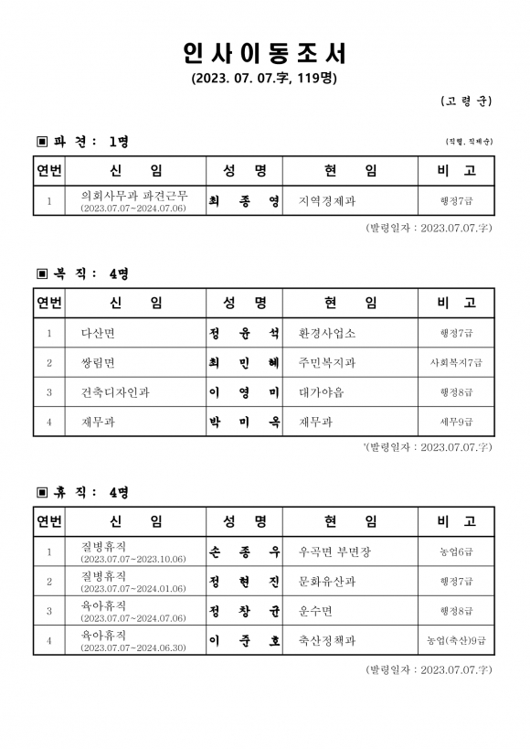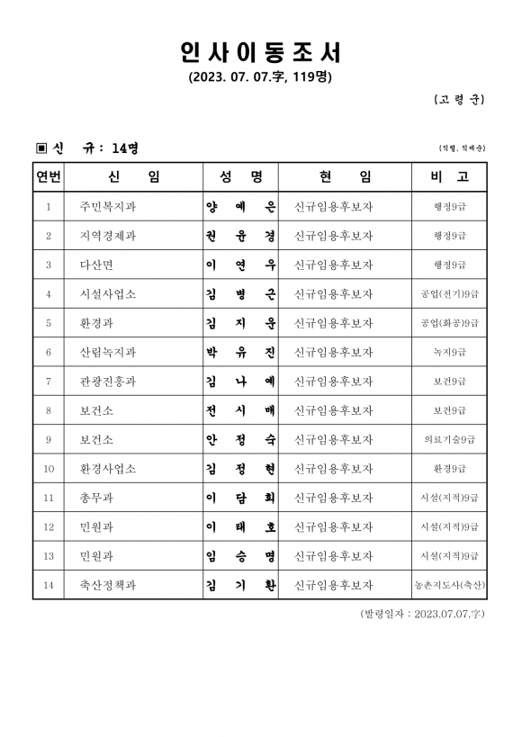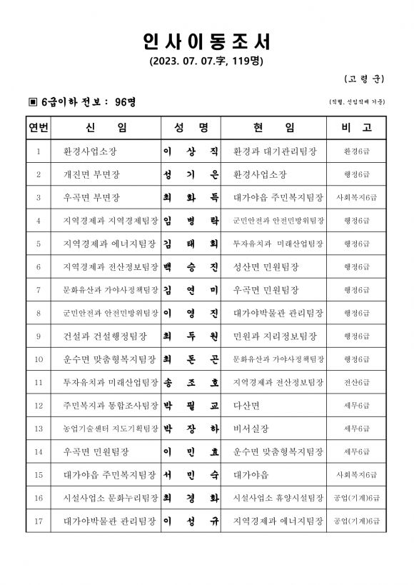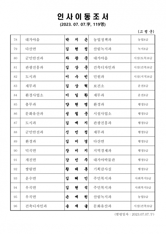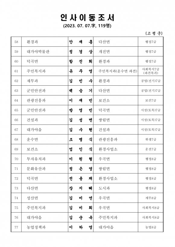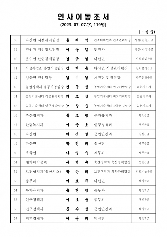 고령군 인사이동조서(23.7.7 자)고령군민신문 기자 / kmtoday@naver.com |