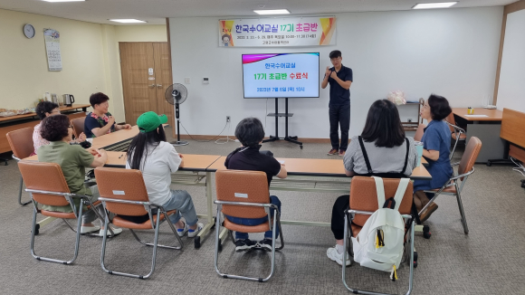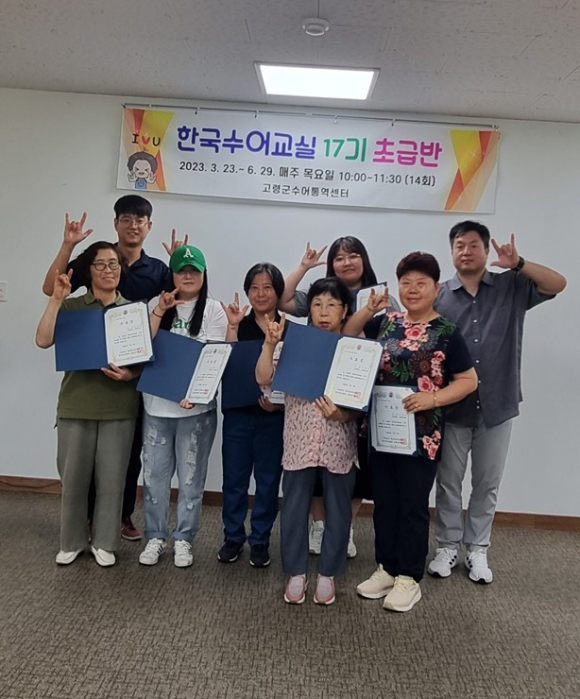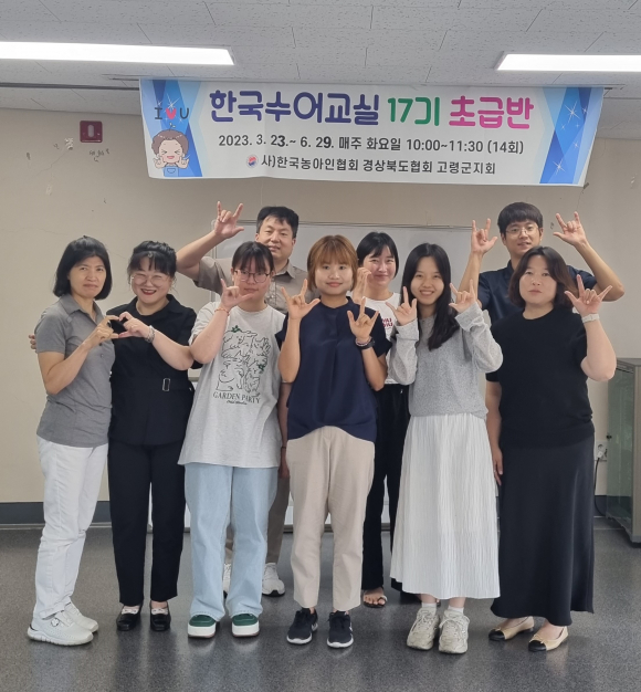 수어를 배우고자하는 고령군민을 대상으로 3월 21일부터 개강하여 다산면 주간반과 대가야읍 주간반으로 나뉘어 총 2개의 과정이 진행되었고 1개의 과정당 총 14회의 교육을 시행한 「한국수어교실 17기 초급반」 교육에서는 다양한 연령과 직업을 가진 사람들이 참여하여 열심히 수어를 배운 결과 총 15명이 신청하여 11명이라는 많은 인원이 수료를 하게 되었다.