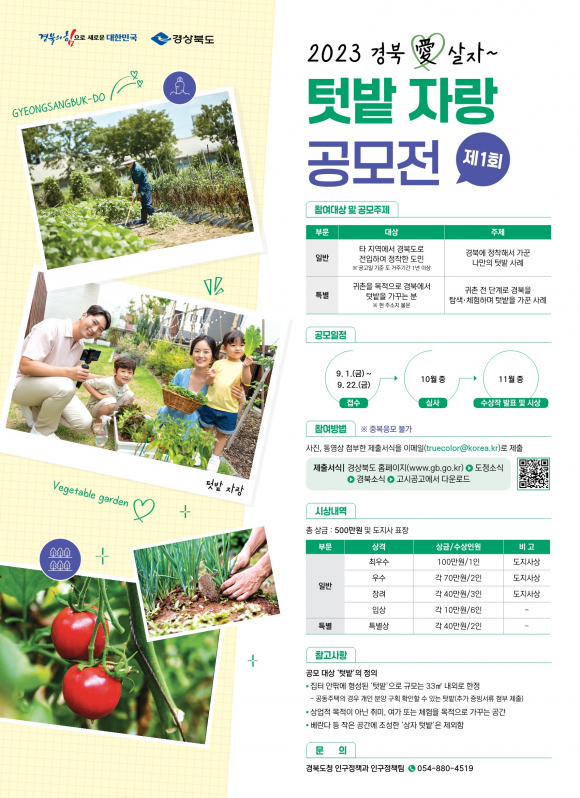 공모 분야는 △타 지역에서 경북으로 정착한 도민의 텃밭 가꾸기 사례 △귀촌 전 단계로서 경북을 탐색하며 텃밭을 가꾼 사례 등 총 2개 분야다.