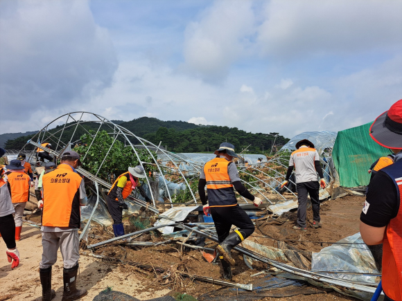 폭우 피해 현장에서 힘들어하는 가족을 위로하고 주택 및 창고 청소, 도로에 쌓인 토사물 제거 및 세척, 농작물 복구작업, 하우스 철거작업 등 활동을 전개했다.