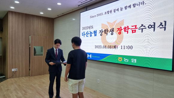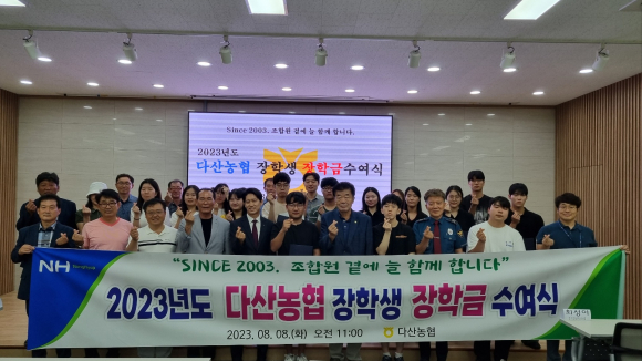 [고령군민신문=김희정기자] 다산농협(조합장 박광보)은 지난 2023.8.8.(화) 오전 11시 다산농협 유통센터 2층 회의실에서 조합원 대학생자녀 27명을 대상으로 1인당 100만원씩 27백만원의 장학금과 장학증서 수여하고 격려 했다.