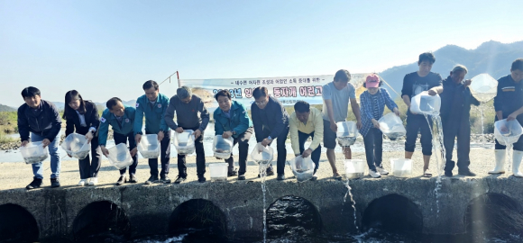 [고령군민신문=이상희기자] 고령군은 지난 25일 낙동강 지류인 운수면 대평리 회천일원에서 경상북도 노성환 도의원, 환동해지역본부 이경곤 해양수산국장 및 운수면 대평리 주민들이 참여한 가운데 잉어류 25,000마리와 동자개 35,000마리를 방류했다.