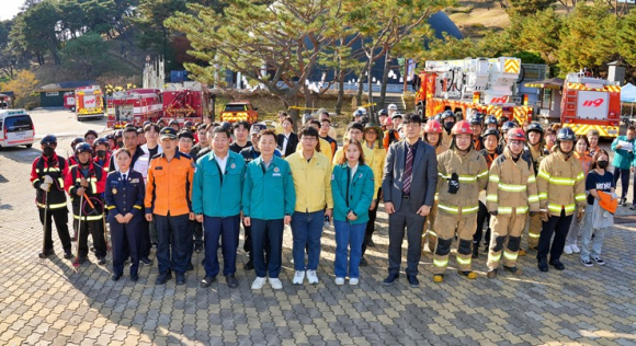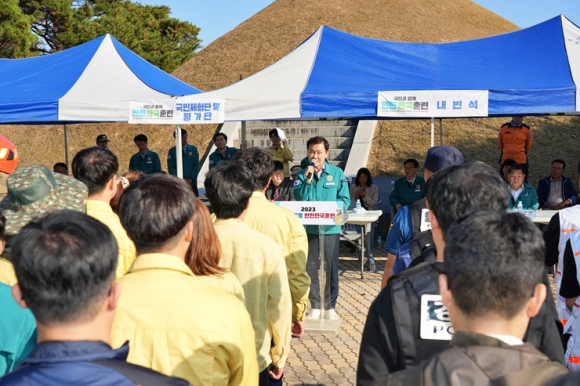 이날 훈련은 방화로 인한 왕릉전시관 화재확산에 따른 산불이 발생할 것을 가정하고 화재상화전파, 자위소방대 활동, 상황판단회의 개최, 긴급구조통제단 가동 및 인명구조, 화재진압, 사고수습 및 복구를 현장과 재난종합상황실에서 실시간으로 연계해 이뤄졌다.