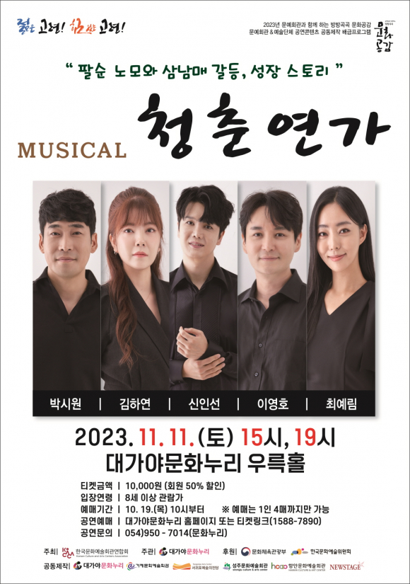 한편 뮤지컬 ‘청춘연가’는 고령대가야문화누리⦁거제문화예술회관⦁서귀포예술의전당⦁성주문화예술회관⦁함안문화예술회관⦁뉴스테이지가 공동제작했다.