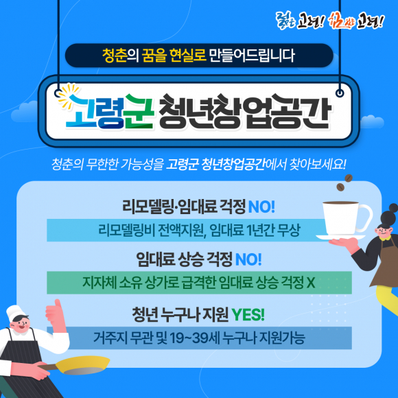 한편 해당 창업공간에 대해서 고령군에서는 공사 리모델링을 전액 지원하며, 업소용 냉장고 등 설비 등도 전액 지원한다. 임대료의 경우 처음 1년간은 전액 지원하고 추후 연장도 가능하다. 그 외 창업 교육 및 사업장 홍보 등을 추가로 지원할 계획도 있다.