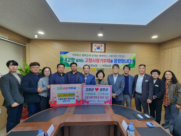 [고령군민신문=김희정 기자] 고령군 쌍림농협(농협장 박상홍)과 성주군 수륜농협(농협장 김용희)은 11월 20일(수) 11시 성주 수륜농협에서 "고향사랑 기부금" 상호기부협약식을 가지며 지역사회에 활력을 불어넣고 있다.