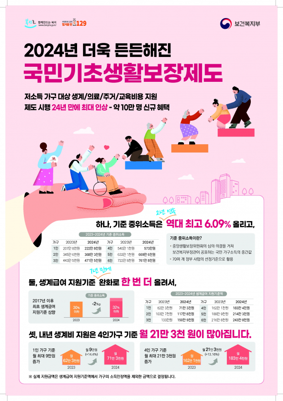 [고령군민신문=이상희기자] 고령군은 2024년 국민기초생활보장 생계급여를 올해보다 27억원 증액한 93억 5천만원을 편성하였다. 내년에는 국민기초생활보장제도의 사각지대를 완화하고 보장성을 강화하기 위하여 자동차 보유 필요성이 높은 6인 이상 다인, 3명 이상 다자녀 가구의 승용·승합자동차에 대한 일반재산 환산율 적용 기준을 완화하고 생업용 자동차는 배기량 1600cc미만에서 2000cc미만으로 확대할 예정이다. 먼저 생계급여 선정기준은 기준 중위소득의 30%에서 32%로 높이고, 4인가구 기준 생계급여 지원 수준을 올해 월 162만 1000원에서 내년 월 183만 400원으로 21만 3000원(13.16%) 인상 예정이다. 단, 실제 지원금액은 생계급여 지원기준액에서 가구의 소득인정액을 제외한 금액으로 결정된다.