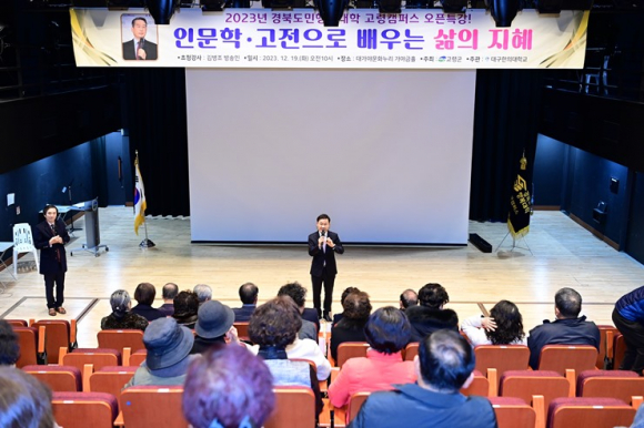 [고령군민신문=이상희기자] 고령군은 연말을 맞이하여 2023년 12월 19일(화) 10시 대가야문화누리 가야금홀에서 경북도민행복대학 오픈특강으로 『방송인 김병조의 인문학특강』‘고전으로 배우는 삶의 자세’를 마련하였다. 이날 행사는 추운날씨와 이른 시간에도 불구하고 이남철 고령군수가 참석한 가운데, 2023경북도민행복대학 수강생 및 고령군민 50여명이 자리를 함께 했다.관내 주민들의 인문학 소양 함양 및 평생교육기회를 제공할 뿐 아니라, 2024년 경북도민행복대학 고령캠퍼스의 새로운 도약을 다지는 자리이기도 했다.