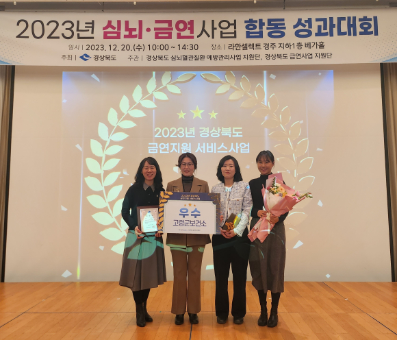 [고령군민신문=이상희기자] 고령군은 2023년 12월 20일 경주에서 열린 경상북도 주관 「2023년 심뇌혈관질환 예방관리사업 금연사업 성과대회」에서 금연지원서비스사업‘우수 기관상’을 수상하였다.