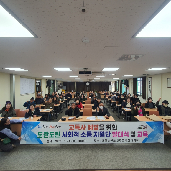 [고령군민신문=이상희기자] 고령군은 1. 24.(수) 오전 10시 대한노인회 고령군지회 대강당에서 노인일자리 참여자 40여 명이 참석한 가운데 도란도란 사회적 소통 지원단 발대식 및 교육을 실시하였다.