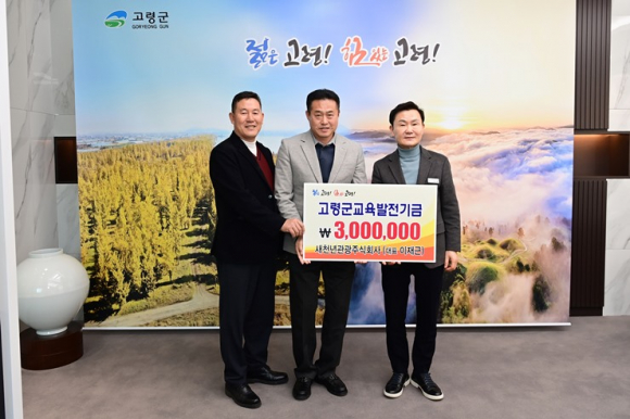 [고령군민신문=이상희기자] 1월 24일(수) 새천년관광주식회사(대표 이재근)에서 고령군청을 방문하여 지역의 교육 발전과 인재 양성을 위해 사용해 달라며 교육발전기금 300만원을 기탁하였다.