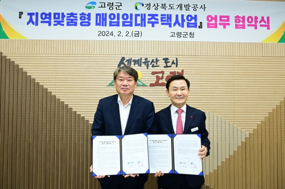 [고령군민신문=이상희기자] 고령군은 2월 2일 고령군청 가야금방에서 지역맞춤형 매입임대주택 사업의 성공적인 업무추진을 위하여 경상북도개발공사(사장 이재혁)와 공동업무협약(MOU)을 체결하였다. 이날 협약식에서는『지역맞춤형 매입임대주택사업』의 성공적 수행을 위한 행정지원과 사업추진에 대해 업무협약을 체결하였으며, 업무협약에 대한 고령군의회 의결 후 매입임대 주택 물량 확정 및 약정 매입공고 등 신속한 업무추진을 이행해 나갈 계획이다.