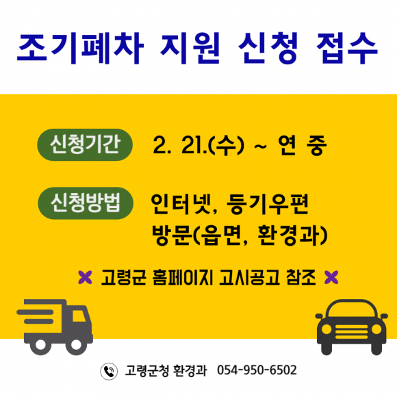 신청 방법은 인터넷(자동차배출가스종합전산시스템), 등기우편으로 신청하거나, 군청 환경과와 읍·면사무소로 방문 신청하면 되고, 자세한 내용은 고령군 홈페이지 고시 공고문이나 환경과 환경정책팀(054-950-6502)으로 문의하면 되고, 선정 결과는 개별 통보 예정이다.