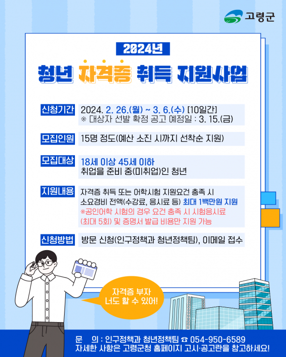 [고령군민신문=이상희기자] 고령군은 미취업 청년들의 경제적 부담을 완화하고 취업 경쟁력 향상을 지원하기 위해 금년 2월 26(월)부터 3월 6일(수)까지 10일간 2024년「청년 자격증 취득 지원사업」대상자를 모집한다.