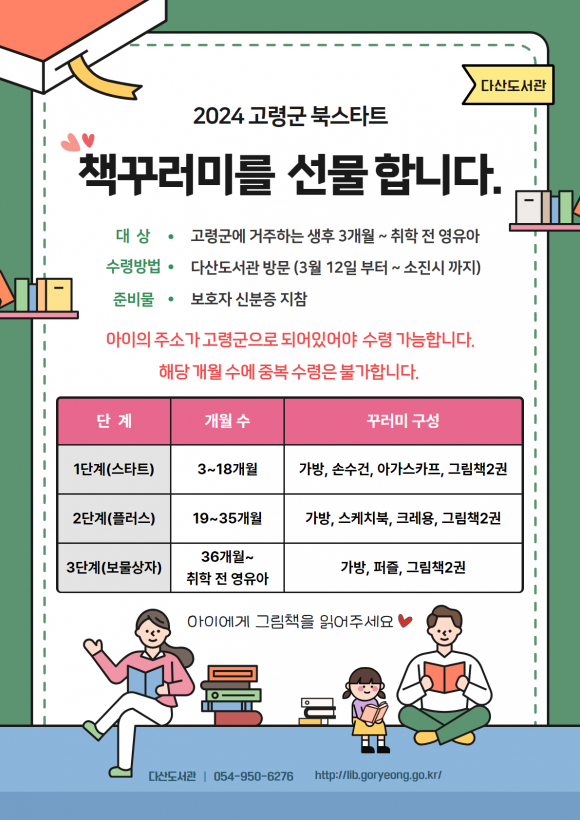 [고령군민신문=이상희기자] 고령군 다산도서관은 3월 12일부터 ‘책과 함께 인생을 시작하자’는 취지인 북스타트(Book Start)사업의 일환으로 책꾸러미를 배부한다고 밝혔다.