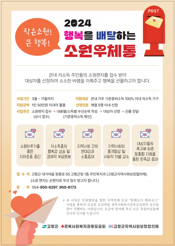 [고령군민신문=이상희기자] 고령군지역사회보장협의체(공동위원장 이남철, 김종태)는 함께모아 행복금고 지원사업으로 2024년 4월부터 11월까지 지역 내 저소득가정의 일상적인 소소한 소원을 이루어주는 “작은소원, 큰행복!” 「소원우체통」 지역 특화사업을 시작한다.