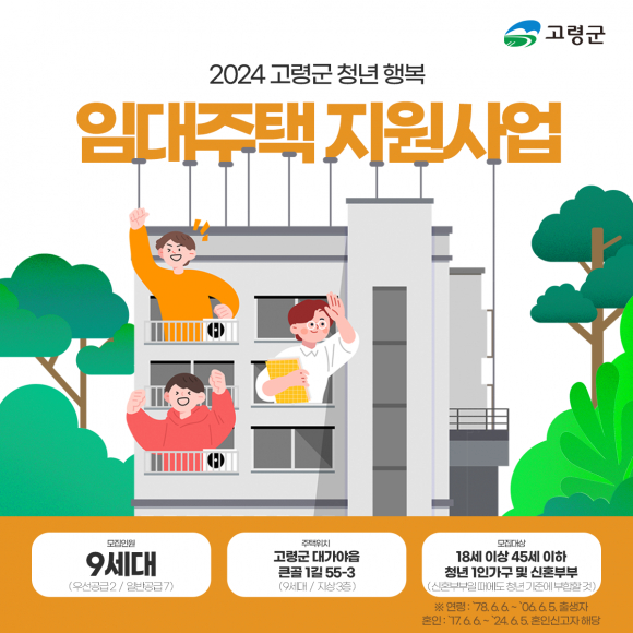 젊은 고령, 힘 있는 고령의 군정 목표를 실현하기 위한 민선 8기의 핵심 공약 사업인 본 사업의 신청자격은 18~45세 청년 1인가구와 신혼부부로 공고일 기준 고령군민이거나 입주일 즉시 전입할 수 있는 외지인을 대상으로 하고 있다. 신혼부부는 혼인 신고일에서 7년이 지나지 않아야 한다. 또한, 제외 대상자는 주거급여 수급자, 주거지원사업 수혜자, 공무원 및 공무직(사립학교 교직원도 포함) 등이며 중복 수혜 등을 차단하여 청년 주거 안정에 기여할 계획이다.