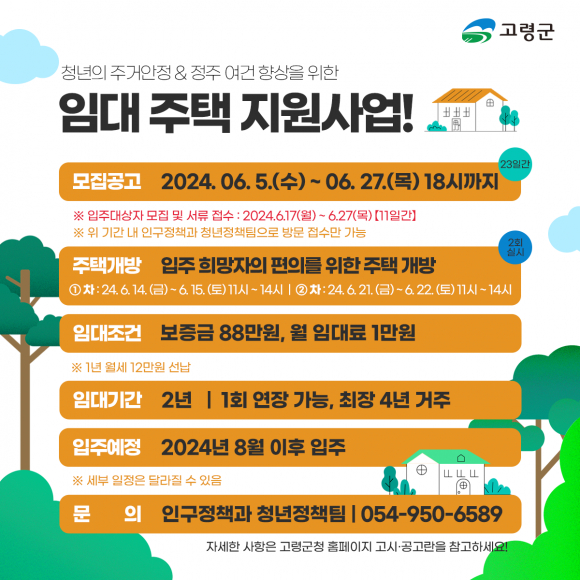 청년 정주여건 개선사업 - 월 1만원의 임대료로 최장 4년 거주 고령군 청년 행복 임대주택 입주 대상자 모집