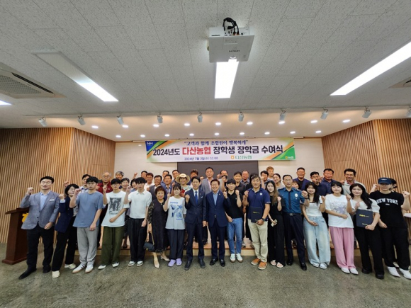 [고령군민신문=이상희기자] 다산농협(조합장 박광보)은 지난 2024.7.3.(수) 오전 11시 다산농협 유통센터 2층 회의실에서 조합원 대학생 자녀 15명을 대상으로 1인당 100만원씩 총 15백만원의 장학금과 장학증서를 수여하고 격려했다고 밝혔다.
