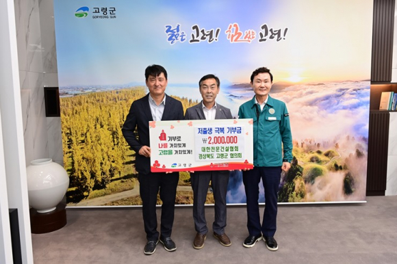 [고령군민신문=이상희기자] 대한전문건설협회 경상북도 고령군협의회(회장 이대원)에서 7월 10일(수) 고령군청을 방문하여 저출생 극복 성금 200만원을 기탁하였다.