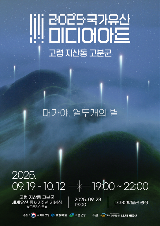 2025 국가유산 미디어아트 고령 지산동 고분군 ○ 주 제 : 대가야, 열두개의 별 ○ 일 시 : 2025. 9. 19.(금) ~ 10. 12.(일) 19:00~22:00 매일 ○ 장 소 : 고령 지산동 고분군 및 대가야박물관 ※경북 고령군 대가야읍 대가야로1203. 이상희기자