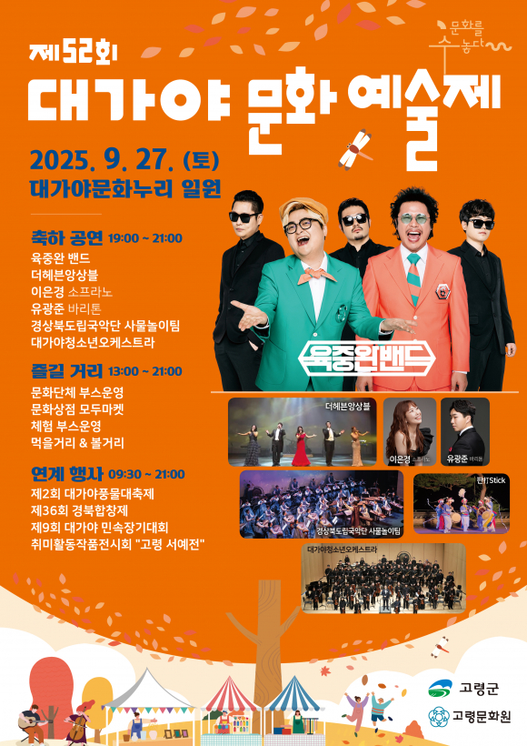 [고령군민신문=이상희기자] 고령군과 고령문화원(원장 신태운)은 오는 9월 27일(토) 대가야문화누리 일원에서‘제52회 대가야문화예술제’를 개최한다. 대가야문화예술제는 고령군을 대표하는 문화·예술 축제로, 매년 군민과 관광객이 함께 어우러지며 다채로운 행사로 대가야의 역사와 문화를 현재에 되살리는 장이 되어 왔다.