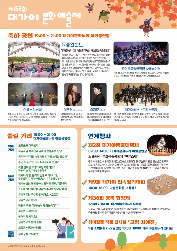 <주요 프로그램> ▶ 축하공연(19:00 ~ 21:00) : 육중완 밴드, 더헤븐앙상블, 이은경(소프라노) 유광준(바리톤), 경상북도립국악단 사물 놀이팀, 대가야청소년오케스트라 ▶ 즐길거리(13:00 ~ 21:00) : 문화단체 부스, 문화상점 모두 마켓, 먹을거리&볼거리 ▶ 연계 행사(09:30 ~ 21:00) : 제2회 대가야풍물대축제, 제36회 경북합창제, 제9회 대가야 민속장기대회, ‘고령 서예전’전시회 특히 올해는 지산동 고분군 일원에서 진행 중인 ‘대가야 미디어아트 빛 체험’(~ 10.12)과 연계해, 대가야문화예술제를 찾는 방문객들에게 전통문화와 첨단기술이 결합된 새로운 문화관광 콘텐츠도 체험할 기회를 제공할 예정이다. 이상희기자