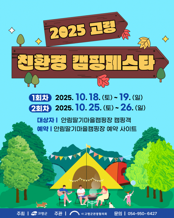 [고령군민신문=이상희기자] 지역과 미래를 배려하는 친환경 캠핑 문화 확산을 위해 마련된 ‘2025 고령 캠핑 페스타’가 오는 10월 18일(토)부터 19일(일), 10월 25일(토)부터 26일(일) 두 차례에 걸쳐 안림딸기마을캠핑장에서 열린다.