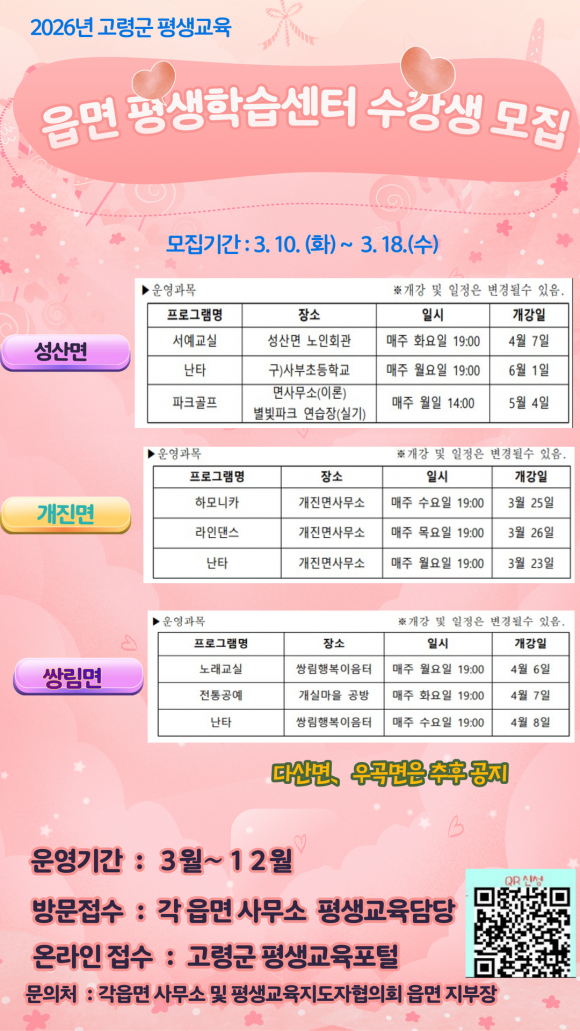 [고령군민신문=이상희기자] 고령군은 지역 주민들의 근거리 학습권을 보장하고 폭넓은 교육 기회를 제공하기 위해 3월 10일부터 18일까지 ‘2026년 읍·면 평생학습센터’ 수강생을 모집한다고 밝혔다.