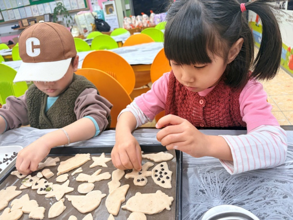 딸기따기 체험을 맞치고 딸기로 반죽한 쿠키를 친구들과 함께 만들었다. 밀가루를 반죽 놀이를 통해 만들어본 경험이 쿠키 만들기를 더욱 즐겁게 만들어 주었다. 반죽에 자기가 좋아하는 곰, 별, 사람 등등 찍기틀로 찍어서 초코와 견과류로 멋지게 꾸며 주었다. 자기가 만든 쿠키를 자랑하며 “엄마, 아빠 드려야지, 나는 지킴이 선생님 드려야지” 하면서 미소를 지어 보였다. 함께 나눌 수 있어서 더욱 행복해 했다.